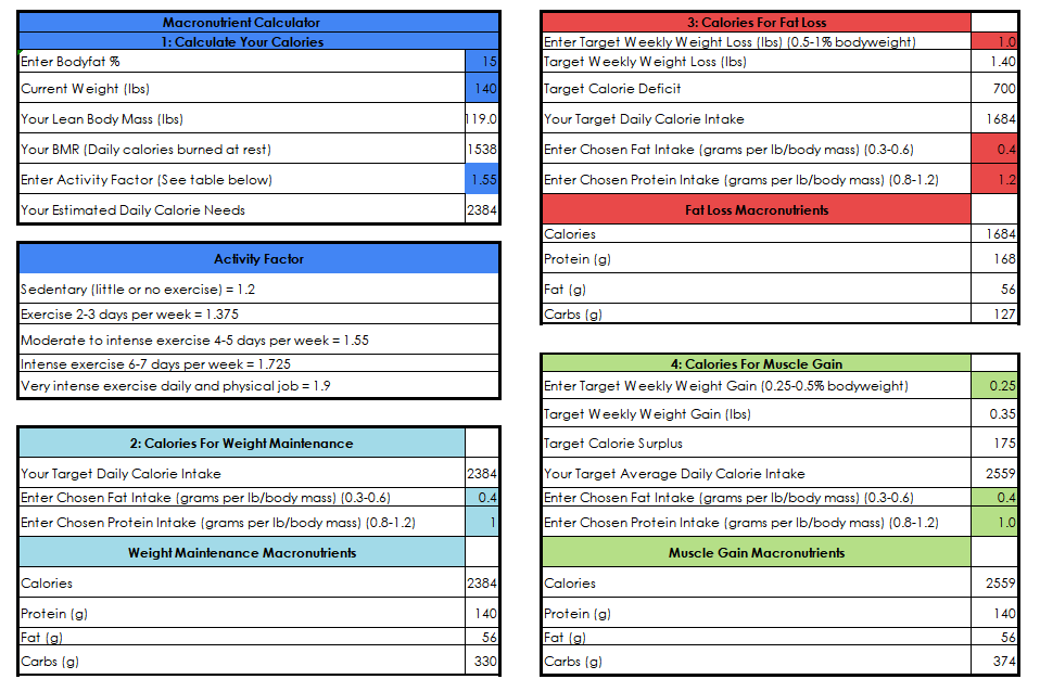 A simple way to automatically calculate your calories and macronutrients for fat loss, weight maintenance and muscle gain. No guess work or hard maths equations involved!